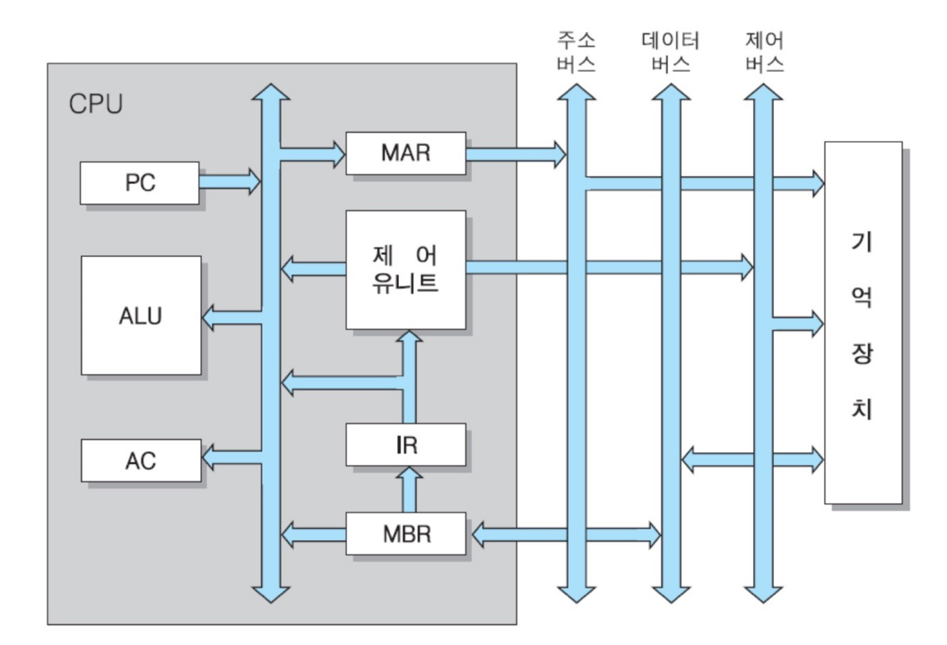 - 기억장치 버퍼 레지스터(MBR): 기억장치에 쓰여질 혹은 읽혀진 데이터를 일시적으로 저장함