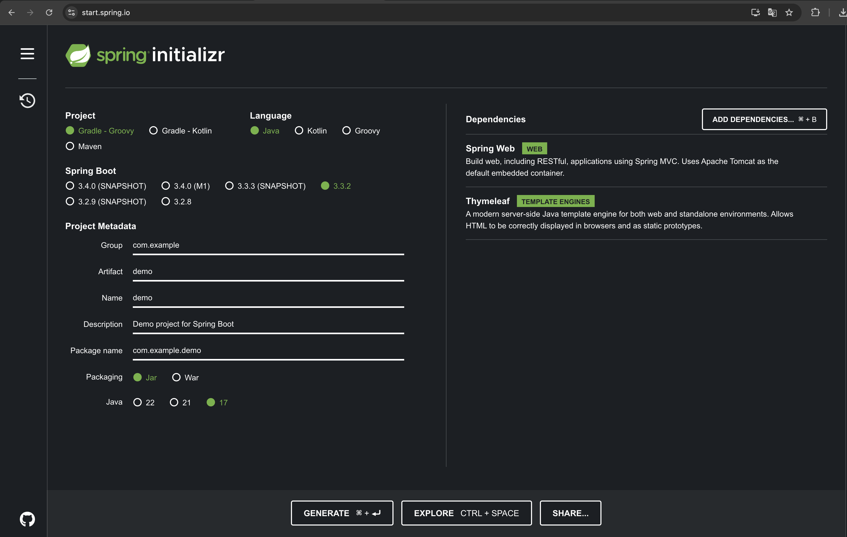 Java 17을 설치 했으니 적절하게 선택해주고, 의존성도 추가하여 Generate 버튼을 클릭하면 프로젝트가 다운 됩니다
