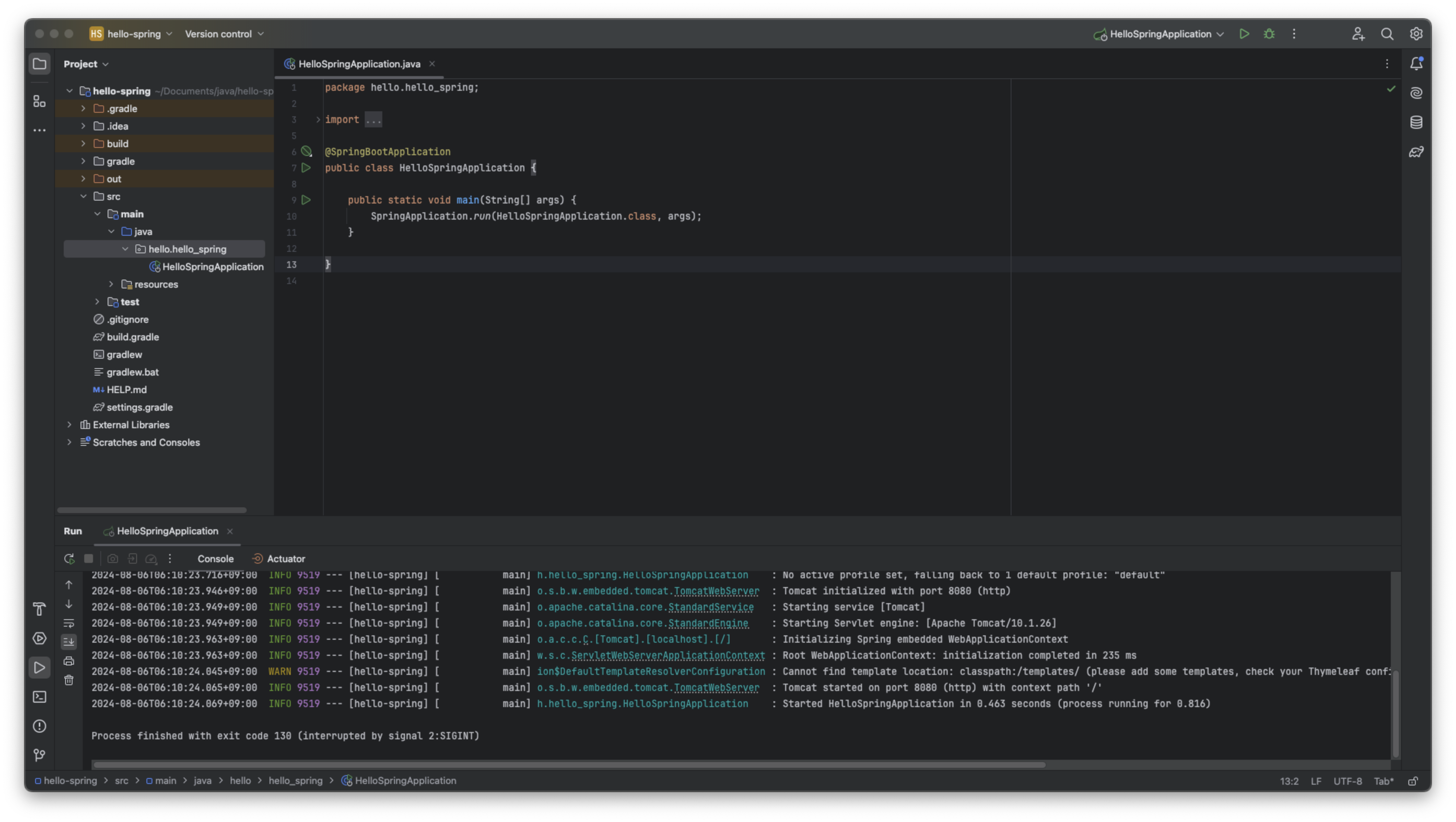 이런 화면이 뜰텐데 여기서 main 함수를 실행 시켜 주시고 Started HelloSpringApplication ~ 이라는 로그가 뜨면