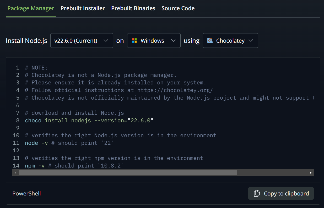 chocolatey 가 깔려있다면 위와 같은 명령어를 입력하여 쉽게 nodejs를 설치 & 확인 할 수 있다.
