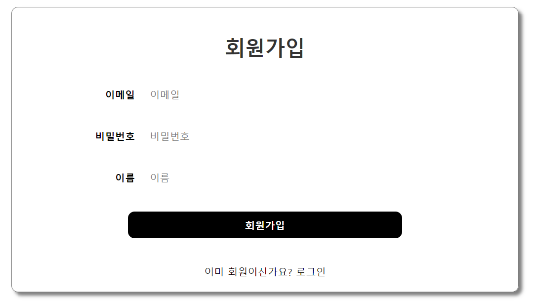 이렇게 이메일, 비밀번호 그리고 이름만 입력 받으면 됩니다.