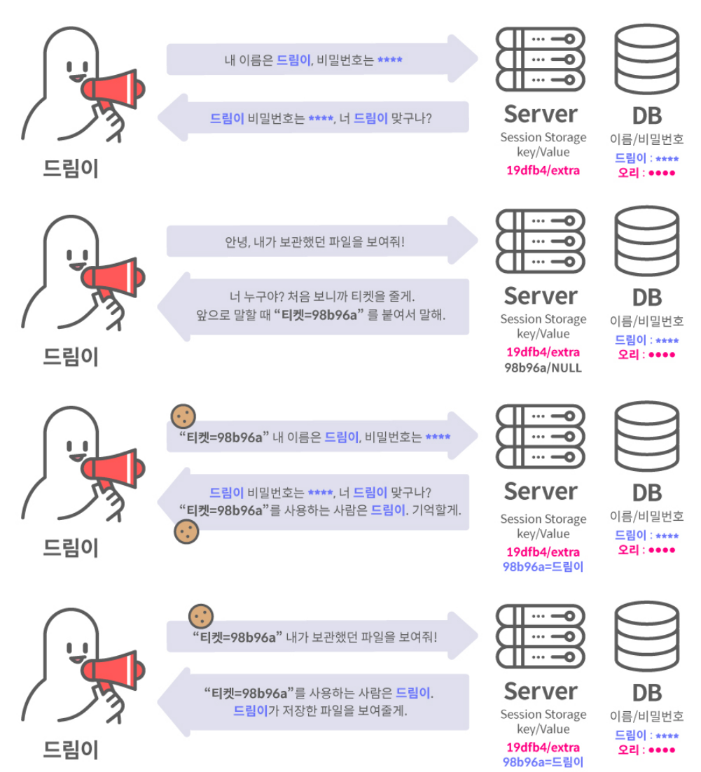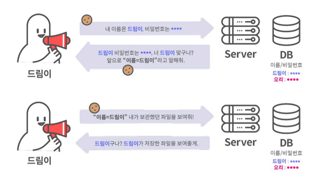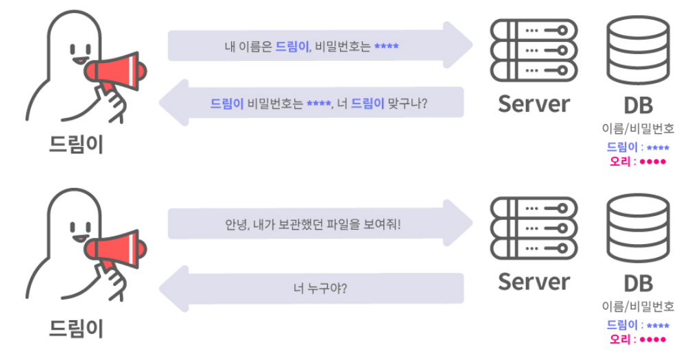 예를 들자면, admin 이라는 사용자로 로그인을 완료했을 때, 클라이언트가 서버에 특정 요청을 할 때마다 자신의 아이디를 말하지 않는 이상 서버는 클라이언트가 어떤 사용자인지 특정할 수 없습니다.