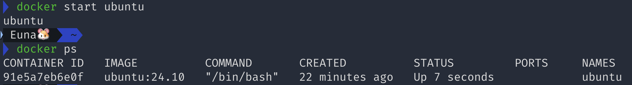 종료된 우분투 컨테이너에 다시 접속하기 위해서는 컨테이너를 다시 시작시켜야 합니다.