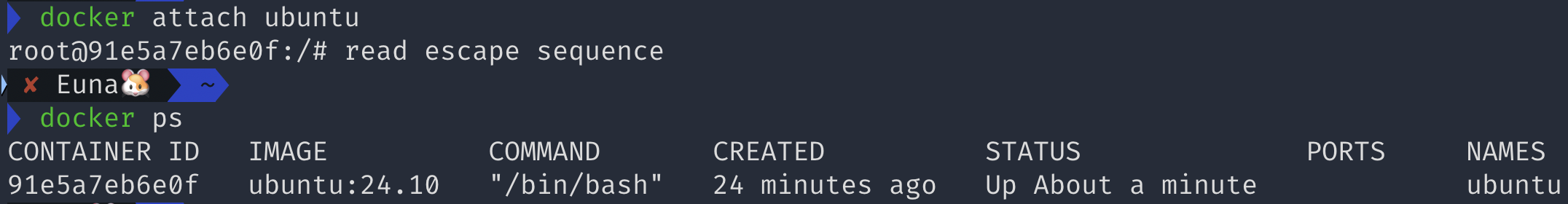 접속을 종료할 때는 아까 알려드렸던 ^ + P , ^ + Q 를 연속으로 눌러 접속을 종료하였습니다.