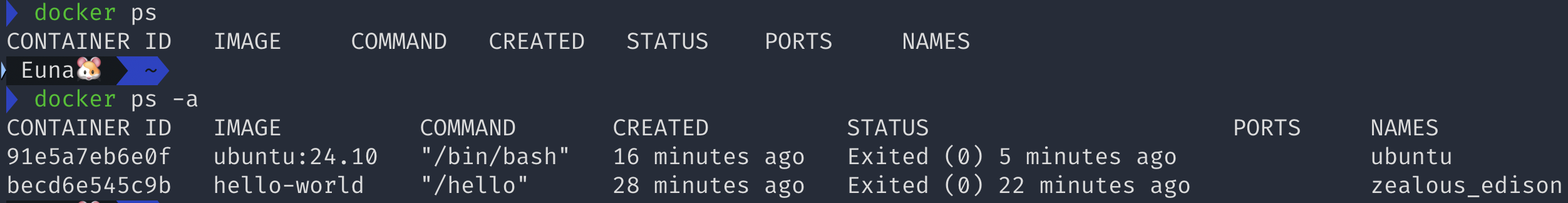하지만 docker ps -a 를 입력하면, 아까 처음에 hello-world 이미지로 생성시킨 임의의 컨테이너 하나와 우분투 컨테이너 하나가 뜹니다.